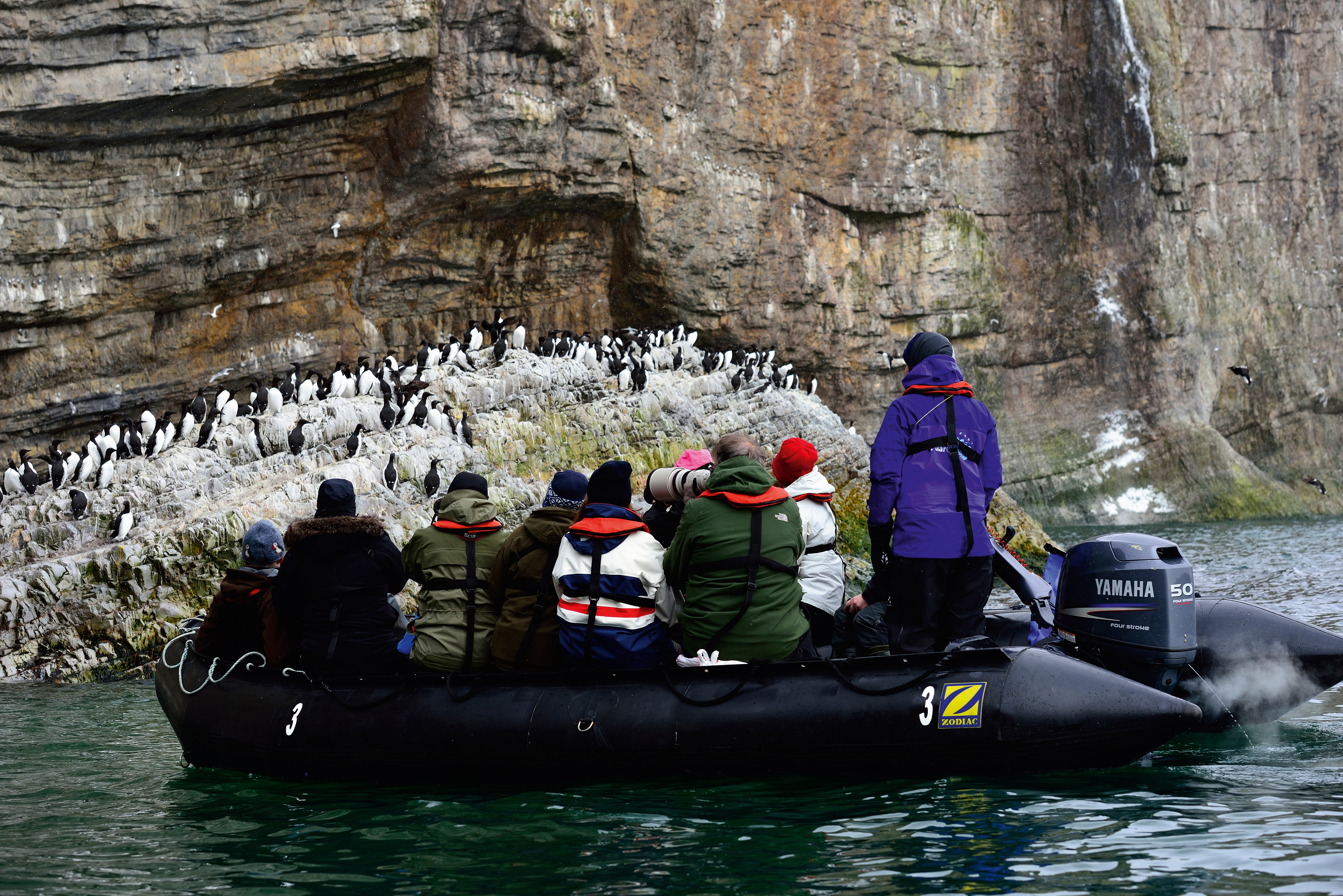 Med våra gummibåtar utforskar vi denna fascinerande klippö mitt ute i Barents hav. Dess avlägsenhet gör att få fartyg per år har möjlighet att stanna till för ett besök. På de 400 meter lodräta klipporna hittar vi en av norra Atlantens största havsfågelkolonier. Här häckar tiotusentals sillgrisslor samt lunnefågel, tordmule, tobisgrissla, tretåig mås och vittrut. Om väder och vind är på vår sida, försöker vi oss såklart på en landstigning på denna sällan besökta ö. Vi fortsätter sedan vår färd in i de arktiska farvattnen. Vi seglar över natten och nästkommande eftermiddag siktar vi ögruppen Svalbard – en av världens mest storslagna vildmarker.