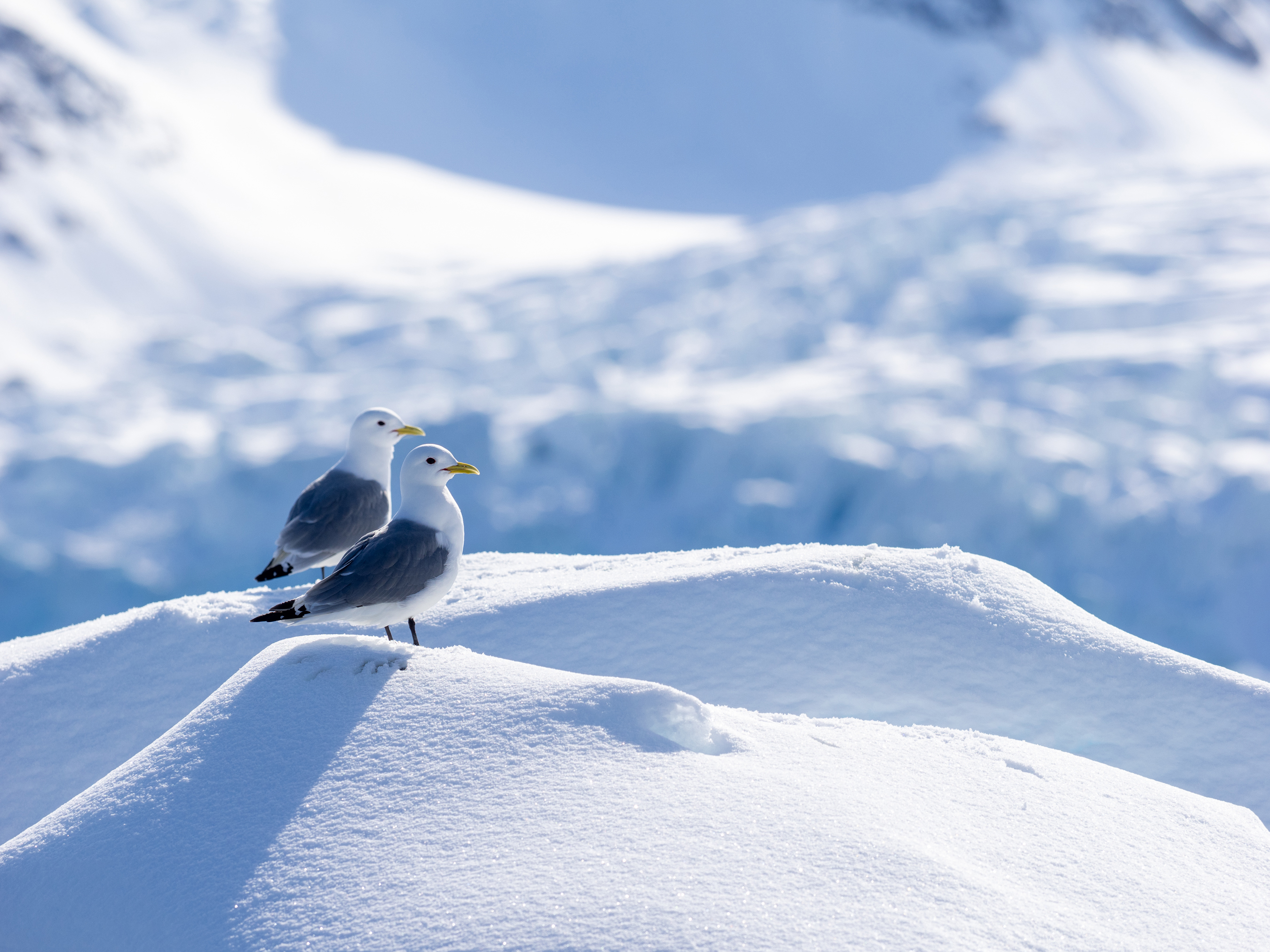 I bildsköna Kongsfjorden ligger den lilla forskarbyn Ny-Ålesund, känd som startplatsen för Nobiles och Amundsens försök att nå Nordpolen och i intilliggande Krossfjorden njuter vi av den vackert skulpterade 14-juliglaciären. På klipporna vid sidan av den isblåskiftande glaciären häckar spetsbergsgrisslor och tretåig mås.